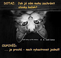 všem, kteří potřebují umístit kočku. Stále se objevují lákavé inzeráty na umístění zvířat. Většinou se jedná o kočky i kocoury jakéhokoliv věku zdarma nebo za symbolickou cenu. Zdarma získaná zvířata ale mohou být využívána pro jiné účely, např. na výcvik loveckých psů a norníků tzv. na ostrost. Více Zajímavosti z tisku a netu Myš není proti kočce bez šance. Když se nechová jako kořist, říká etoložka (Hobby.idnes.cz 21.4.2014) Budete možná překvapeni, co si o vás myslí vaše kočka (hobby.idnes.cz 31.3.2014) Kolik koček je tak akorát? (MVDr. Hana Žertová 3.8.2013)