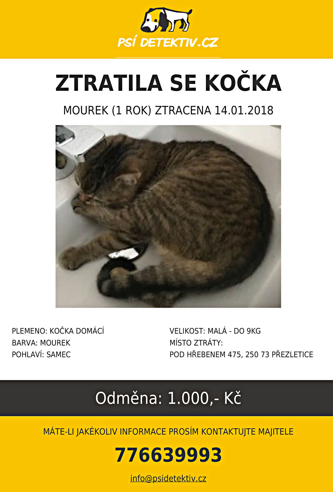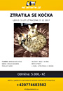 Hledá se kocour (Přezletice -Praha východ) (15.1.2018) Dobrý den, v Přezleticích, Pod Hřebenem se 14. 1. ztratil kastrovaný mourovatý kocour!!! Ztratil se od domu v neděli přes den. Je zvyklý být přes noc venku, ale nikdy nechodí dál než na zavolání. Nikdy nechodil na delší dobu. Je kastrovaný, má velmi hustou srst a teď přes zimu dost vykrmený. Váha 3,5 - 4 kg. Nemá obojek ani čip. Pokud byste o něm získali jakékoliv informace, zavolejte nám prosím na naše telefonní číslo 776639993, případně napište na email 1mg@seznam.cz. Odměna 1000 Kč!!! Děkuji za pomoc. Gabriela Jenčíková Aktuální info o pátrání najdete zde Ztratil se 5 let starý bengálský kocour (Praha 4-Braník) (9.1.2018) Dobrý den, na Praze 4-Braník, ul. U Dubu se 25.12.2017 ztratil 5 let starý bengálský kocour Lexus!!! Pokud byste o něm získali jakékoliv informace, zavolejte nám prosím na naše telefonní číslo +420774683502, případně napište na email Akils@seznam.cz. Lexus je 5 let starý tečkovaný bengálsky kocourek. Neměl obojek, má čip (900008800309343). Je kastrovaný. Váží cca 5 kg. Na pobyt venku je zvyklý, chodí ven na záchod, vždy se vracel. Pokud byste byli tak hodní, vytiskněte prosím pátrací letáček, který naleznete v příloze emailu a vyvěste ho na nástěnku, do výlohy či na jiné viditelné místo. Také si ho můžete vložit na své webové stránky. Odměna 5000 Kč!!! Aktuální info o pátrání najdete zde Děkuji za pomoc, Saltanat Akilbekova Hledá se kocour (Praha 14 - Kyje)(9.1.2018)